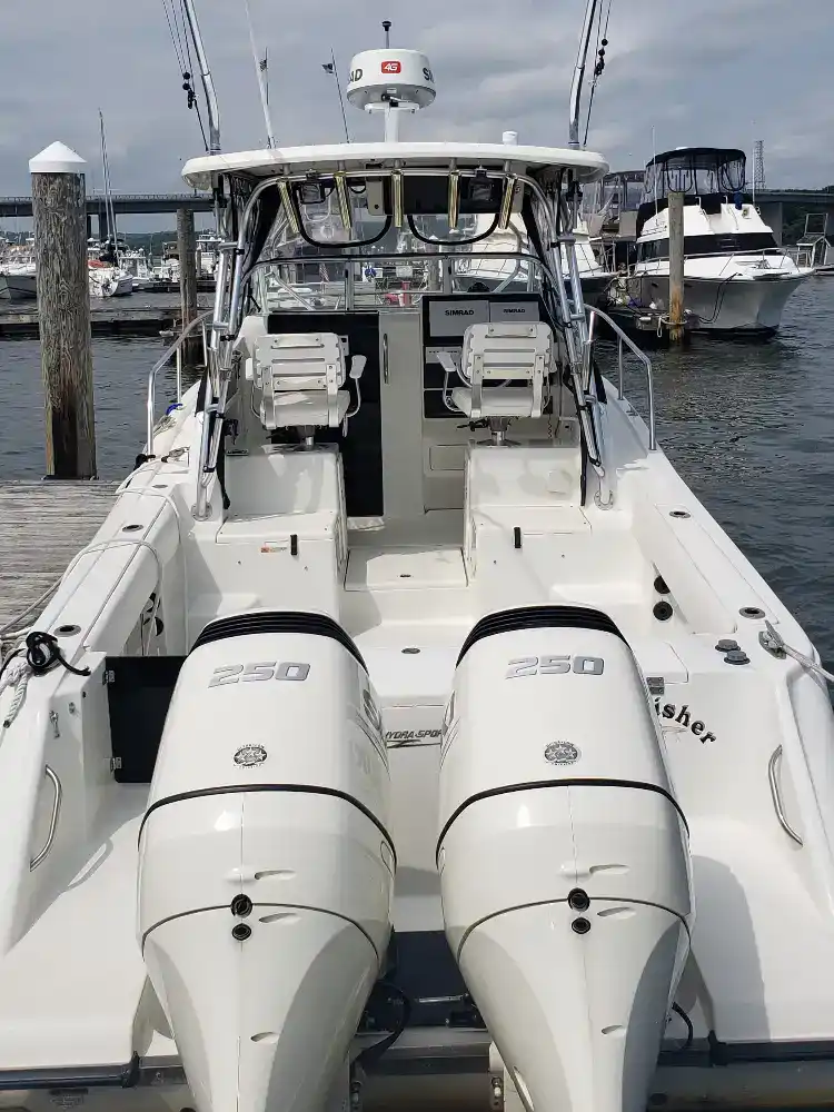 The Kingfisher fishing charter boat is a 28'  2001 Hydra Sports walkaround, with a cuddy cabin and full bathroom. Powered by clean and quiet twin 250 Suzuki outboards, the deep V hull cuts through choppy waters and cruises at 30 Knots. This will get you to the fishing grounds twice as fast as most other CT charter boats, WITHOUT SMELLY DIESEL FUMES. The boat is perfectly set up for fishing live bunker with a 45 gallon live well, 2 large insulated fish boxes, color fishfinders, radar, and all coast guard required safety equipment (including 406 EPIRB).